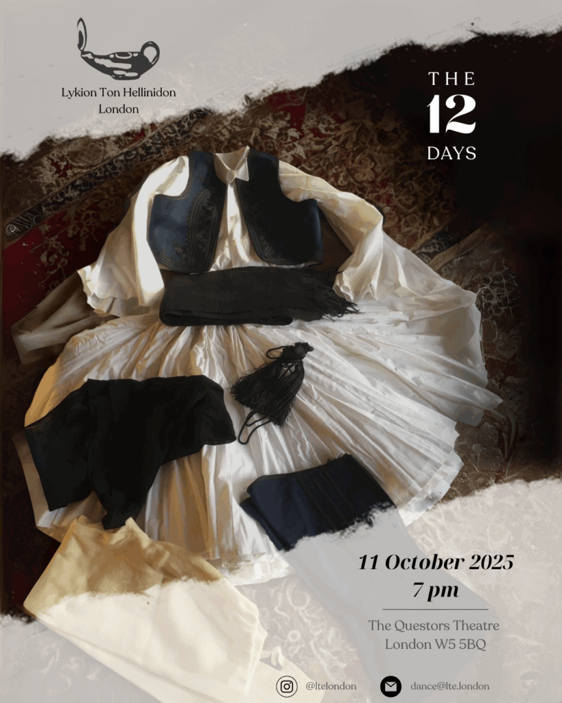 Το Λύκειον των Ελληνίδων Λονδίνου παρουσιάζει με υπερηφάνεια την παραγωγή Οι 12 Ημέρες, μια λαμπρή γιορτή των ελληνικών χριστουγεννιάτικων παραδόσεων, μέσα από τον παραδοσιακό χορό, τη ζωντανή μουσική και το τραγούδι. Η εντυπωσιακή αυτή παράσταση αφηγείται το εορταστικό ταξίδι από την Παραμονή των Χριστουγέννων έως τα Άγια Θεοφάνεια, αποτυπώνοντας τη χαρά, τη βαθιά πνευματικότητα και το αίσθημα συλλογικότητας που χαρακτηρίζουν μία από τις πιο αγαπημένες περιόδους του ελληνικού εορτολογίου.